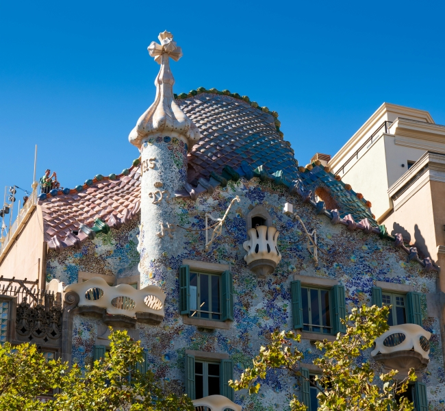 【巴特罗之家】高迪创作成熟期完成度最高的现代主义建筑作品。巴特罗之家的内部设计也秉承了高迪一贯的作风,没有直线和棱角,全是柔和的波浪与曲线。行走在建筑物中时,仿佛走在巨龙的体内,而彩色的屋顶正是盘旋着的龙身,身上的鳞片清晰可见。